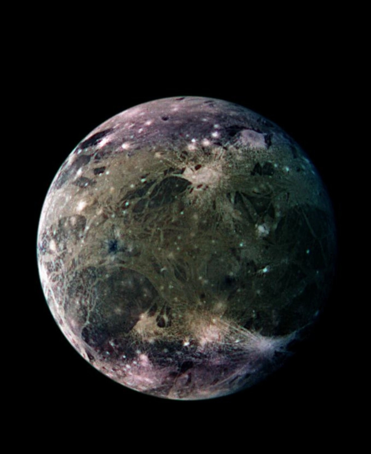 Ganymede, güneş sistemindeki en büyük uydudur; hatta Merkür gezegeninden bile büyüktür. Karanlık yüzeyi çıkıntılarla kaplıdır. Yüzeyin bazı yerlerinde beyaz lekeler görülür bunlar güneş sisteminin oluşum aşamasından kalan enkazın parçaları olan göktaşlarının uyduya çarpıp yerkabuğuna gömülerek açtıkları kraterlerden etrafa buz sıçratarak oluşturulmuştur.