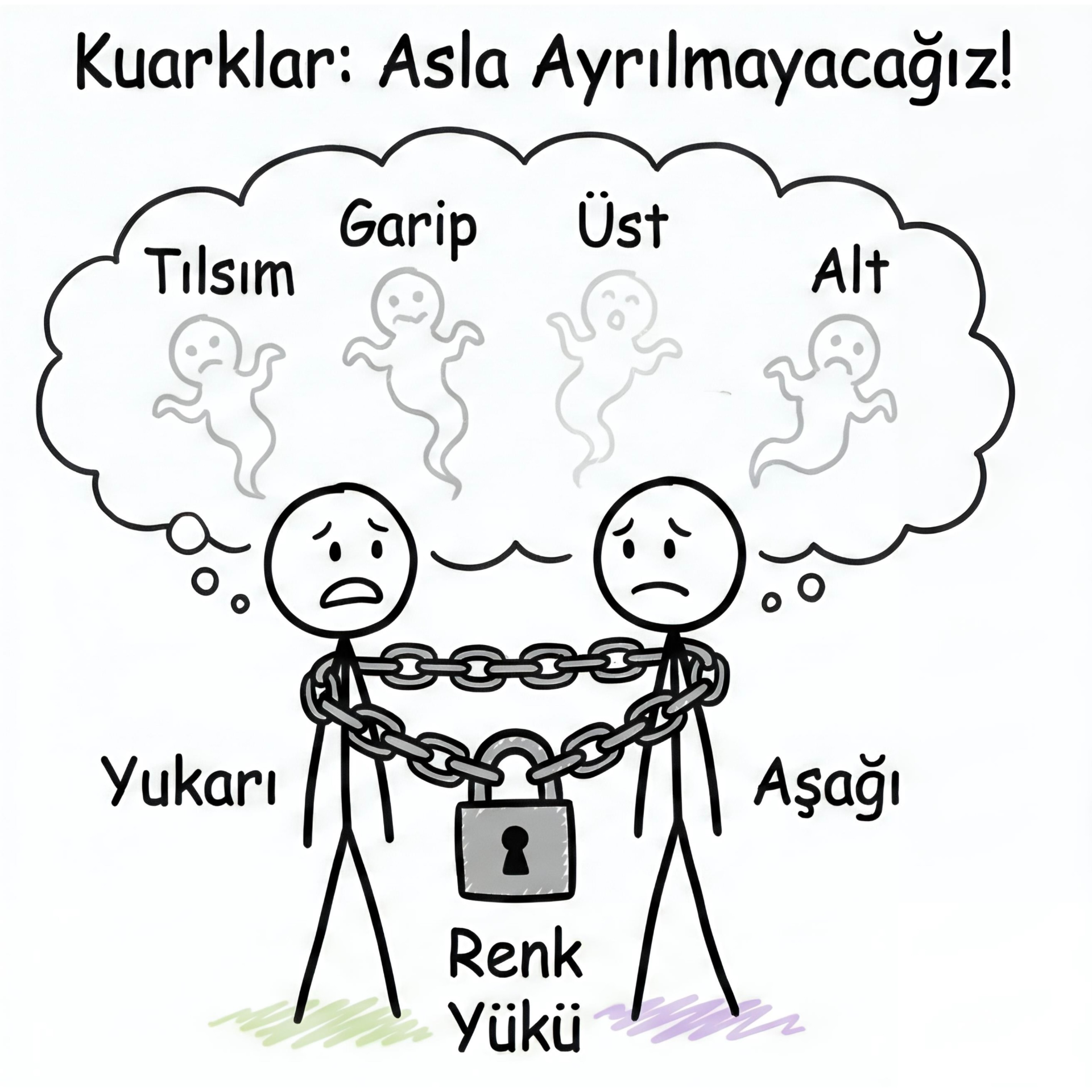 Kuarklar: Proton ve nötronların içindeki "bölünemez" asıl çocuklardır. Altı farklı türü (veya tatlı tabiriyle "çeşnisi") vardır ama evreni inşa etmek için doğa genelde sadece ikisini kullanır: "Up" (yukarı) ve "Down" (aşağı) kuarklar. Diğerleri (tılsım, garip, üst ve alt kuarklar) sadece çok yüksek enerjili ortamlarda anlık olarak belirip kaybolurlar. Kuarkların en ilginç yanı asla yalnız gezmemeleridir. "Renk yükü" denilen bir özellikle birbirlerine o kadar sıkı tutunurlar ki, onları tek başına görmek neredeyse imkânsızdır.