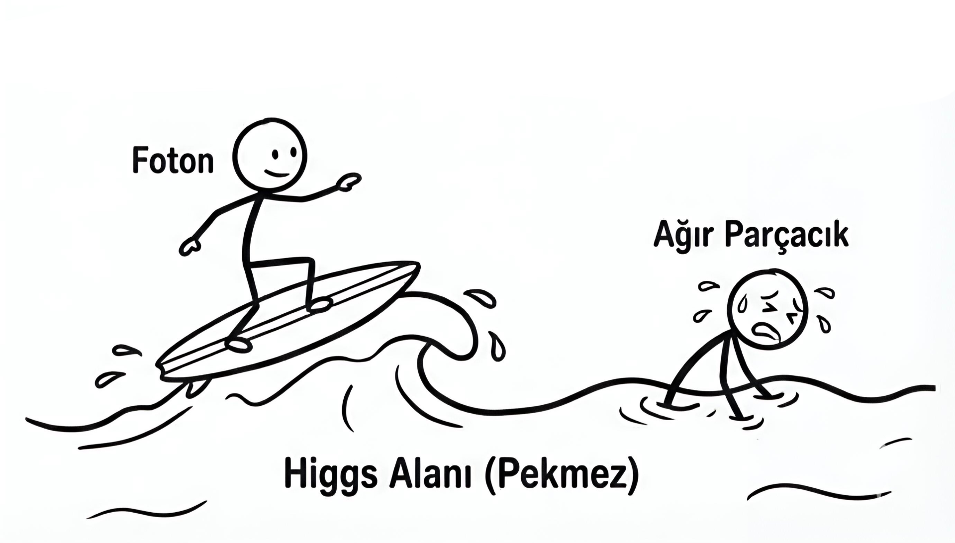Higgs bozonunu anlamak için evreni görünmez ve yoğun bir kar tabakasıyla (Higgs alanı) kaplı düşünün. Bazı parçacıklar (foton gibi) bu karın üzerinden kayıp gider, yani kütlesizdir. Bazıları ise (elektron veya kuark gibi) kara batarak ilerler, zorlanır. Bu "zorlanma" aslında parçacığa kütlesini kazandıran şeydir. Higgs olmasaydı, parçacıklar ışık hızında savrulur ve yıldızlar, gezegenler ve hatta biz oluşamazdık.